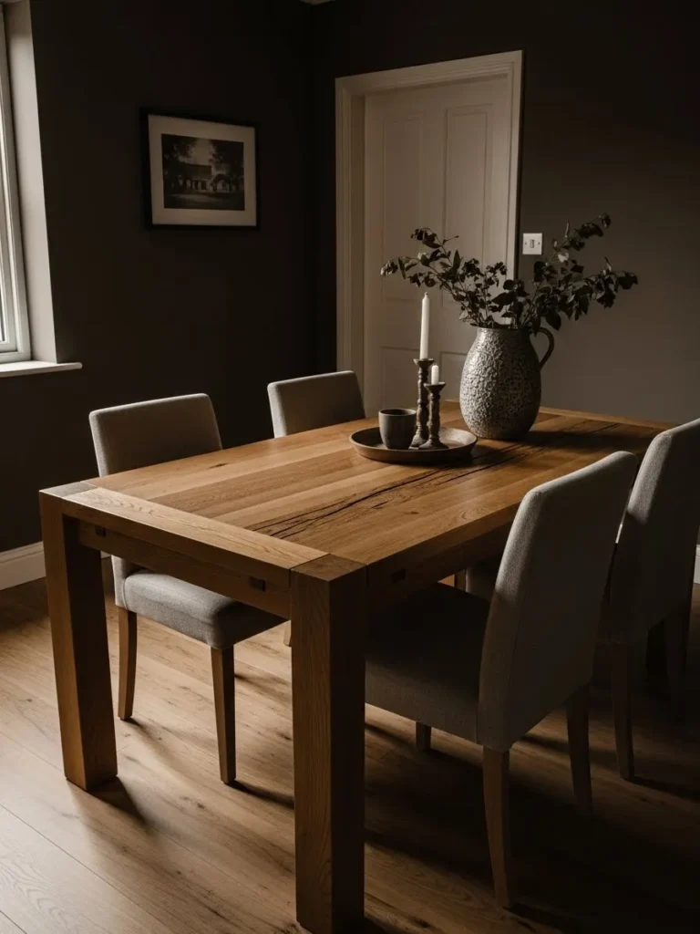 A dark charcoal paint color gives this dining room a modern and grounded feel. The simple furniture and clean lines let the wall color do most of the work. Natural light softens the darkness and keeps the space from feeling closed in. Wood textures add warmth and keep things balanced.