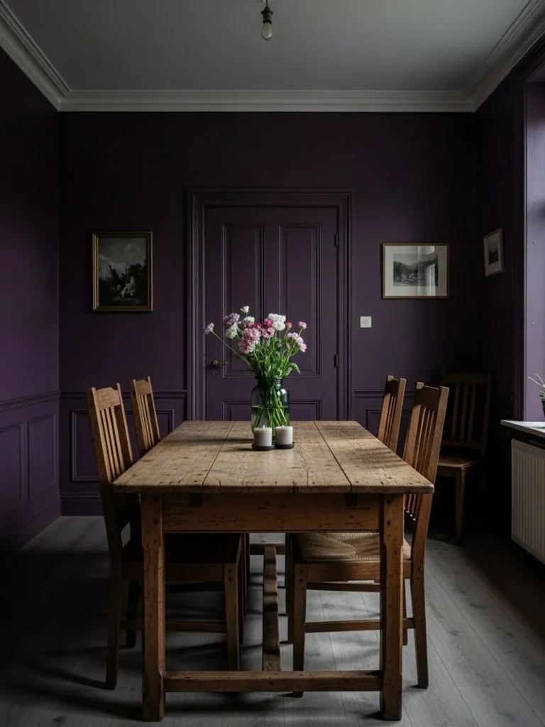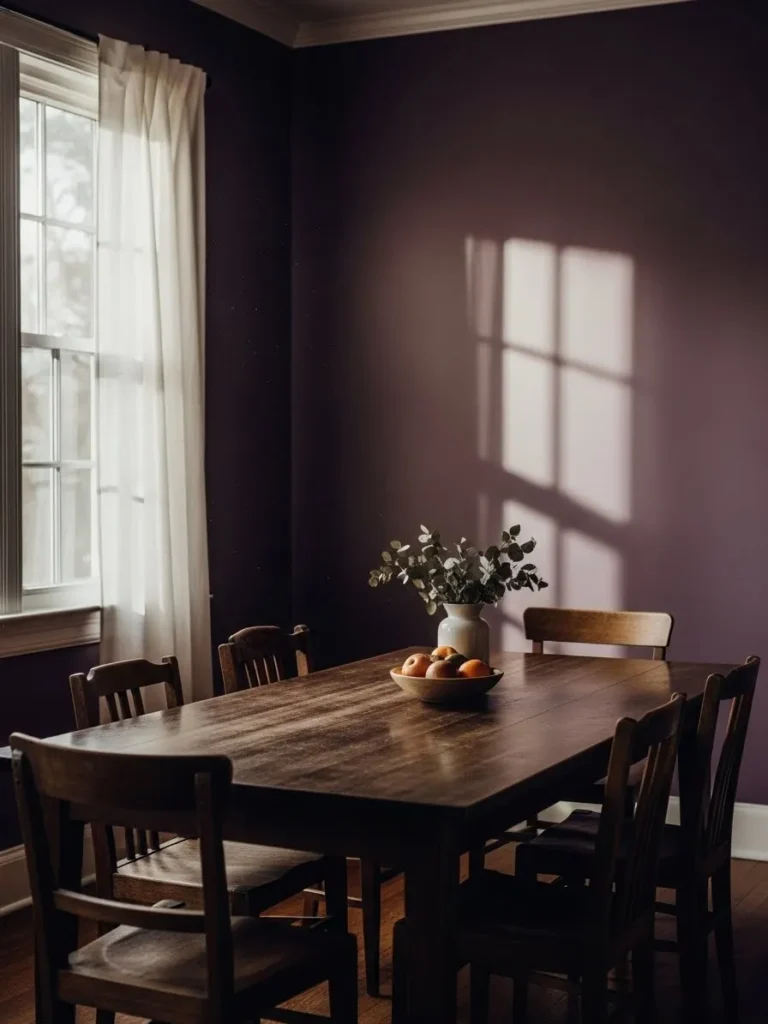 This dining room features a soft plum tone that feels moody yet warm. The color has depth but still lets natural light shine through. A rustic wood table and classic chairs add character and make the space feel lived in. The overall vibe feels calm and slightly nostalgic.