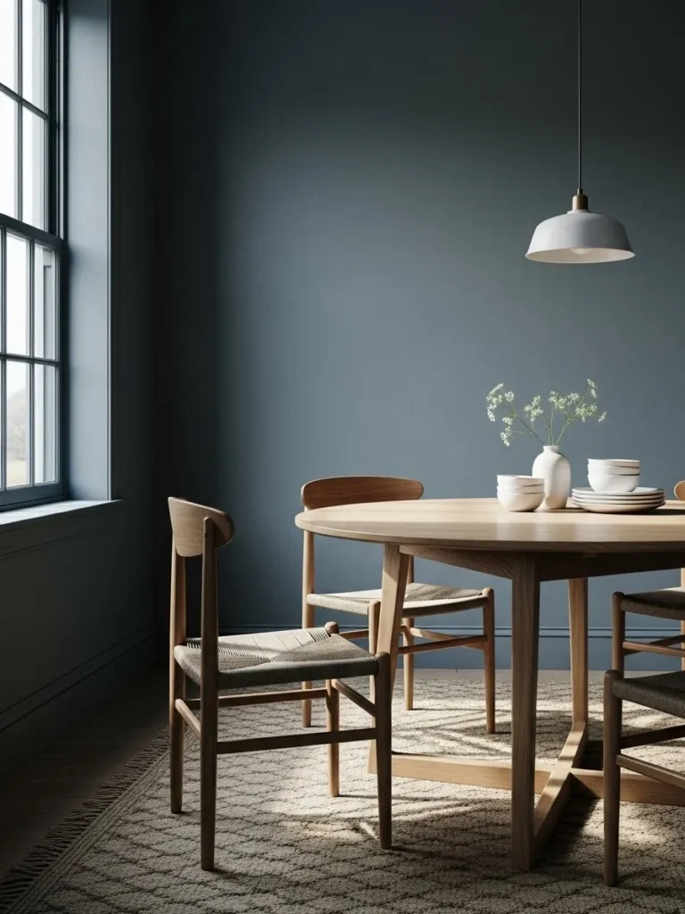 This dining room features a smoky slate wall color that feels calm and refined. The subtle texture in the paint adds depth without stealing attention. Light wood furniture brings warmth and contrast to the darker tone. The space feels minimal and thoughtfully balanced.