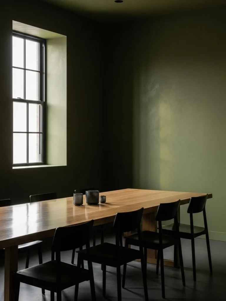 This dining room is wrapped in a muted olive green that feels calm and grounded. The paint color pairs beautifully with the natural wood table and simple black chairs. Daylight from the window washes across the walls and softens the depth of the green. The space feels minimal but still warm and inviting.