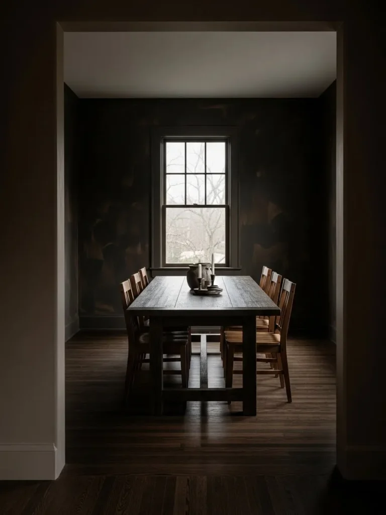 A deep olive brown paint color wraps this dining room in a warm and intimate atmosphere. The long wooden table and simple chairs feel grounded against the darker walls. Soft shadows add to the cozy mood and make the space feel enclosed in a good way. Everything feels relaxed and intentional.