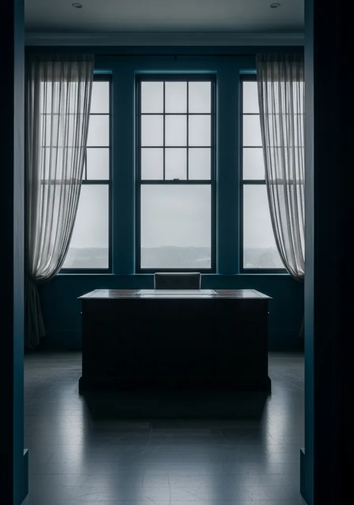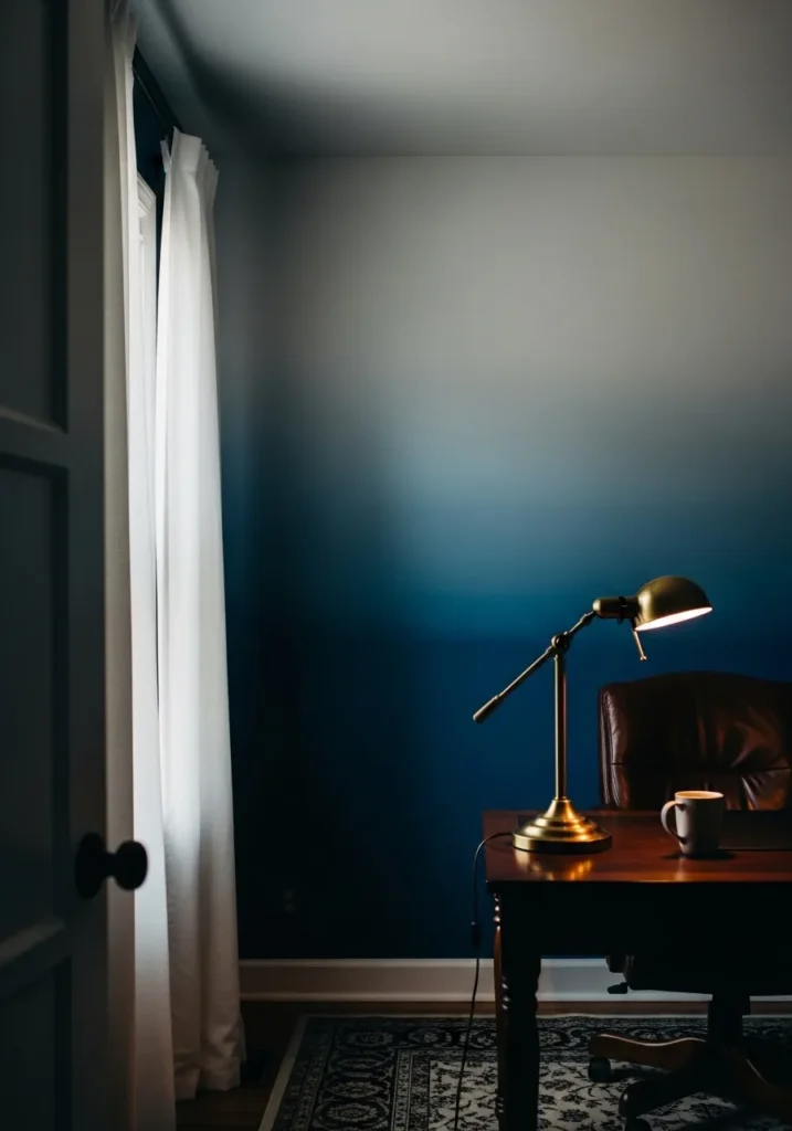 This moody home office wraps the walls in a rich deep blue that fades slightly darker toward the corners, creating a cocoon like feel. Soft daylight filters through a simple white curtain, casting gentle shadows across the matte paint. A classic wooden desk sits near the window, styled with a sleek brass task lamp that adds a warm glow against the cool toned walls. The space feels intimate and focused, with minimal decor and a calm, slightly dramatic atmosphere.