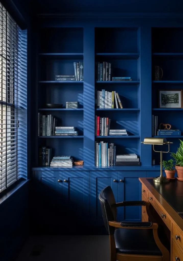 This home office makes a statement with a vibrant yet moody cobalt blue covering the built in shelves. The color has a richness that instantly draws the eye and makes the books pop against the background. A simple wooden desk sits nearby, allowing the blue shelving to take center stage. Light from the window creates a beautiful contrast along the edges of the shelves.