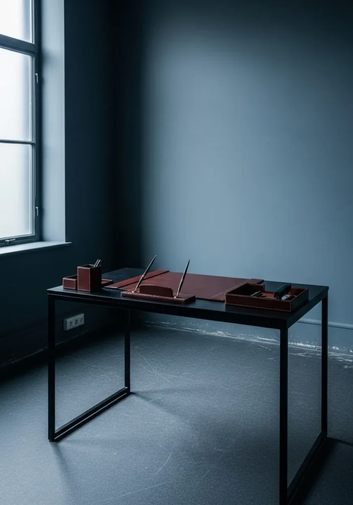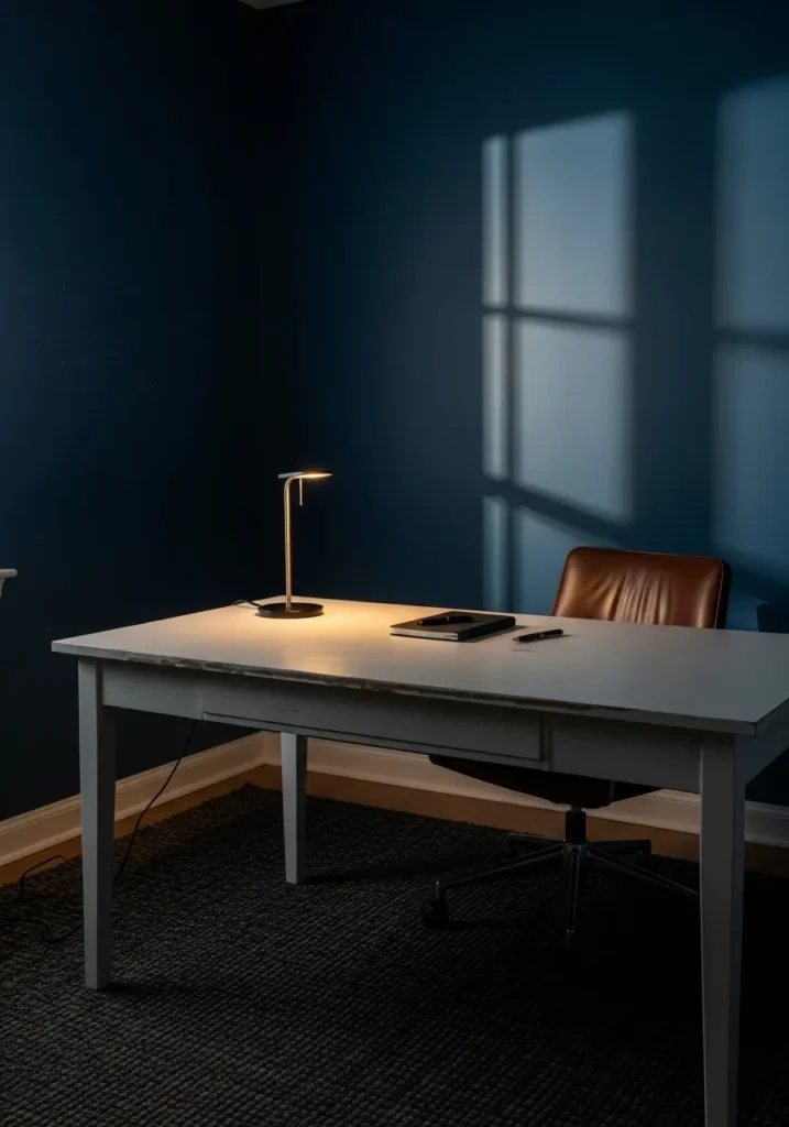This room features a smooth navy wall that frames a simple white desk and a sleek brass lamp. The deep blue absorbs light in the corners while the window casts a soft square of brightness across the surface. A leather chair adds warmth and texture against the cooler tones. The overall look is minimal but striking.
