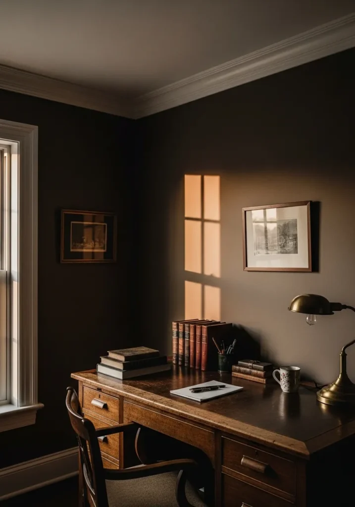 This office uses a rich taupe paint that leans slightly brown, creating a cozy and grounded atmosphere. The walls glow beautifully when late afternoon sunlight streams through the window. A classic wooden desk and a brass lamp add warmth and texture to the space. Framed artwork on the wall keeps the look personal but understated.