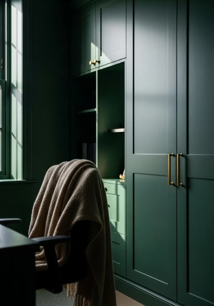 This home office features full height cabinetry painted in a rich emerald green that instantly sets a refined tone. The matte finish absorbs light beautifully, while slim brass handles add a subtle hint of polish. A cozy chair draped with a soft throw sits nearby, bringing warmth to the bold color choice. Natural light from the window highlights the depth of the green and gives the space a tailored, built in feel.