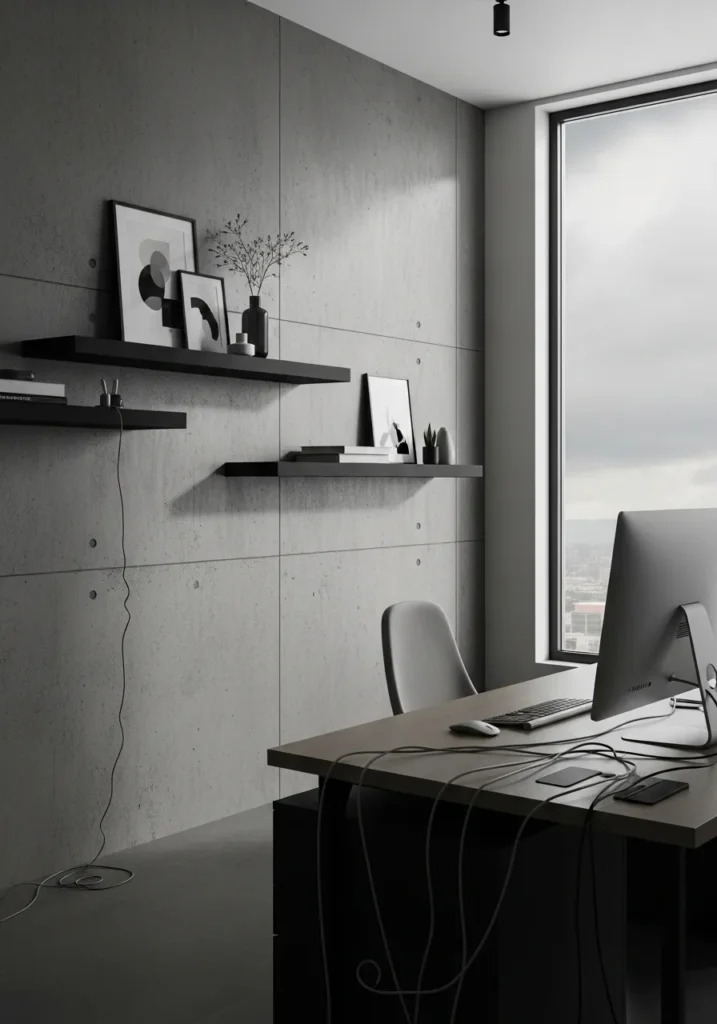 This office embraces a smooth concrete gray wall that feels modern and quietly dramatic. Floating shelves and a streamlined desk keep the look clean and uncluttered. The large window allows soft daylight to wash over the neutral palette, creating gentle shadows along the wall. Everything feels intentional and pared back.
