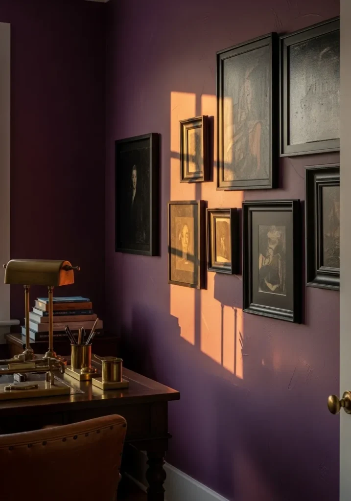 This office highlights a deep plum wall that becomes even richer when warm sunlight streams through the window. Framed artwork arranged in a gallery style adds character and texture against the bold paint. A wooden desk with classic details grounds the space and keeps it feeling balanced. The contrast between the purple tone and the golden light creates a beautiful layered effect.