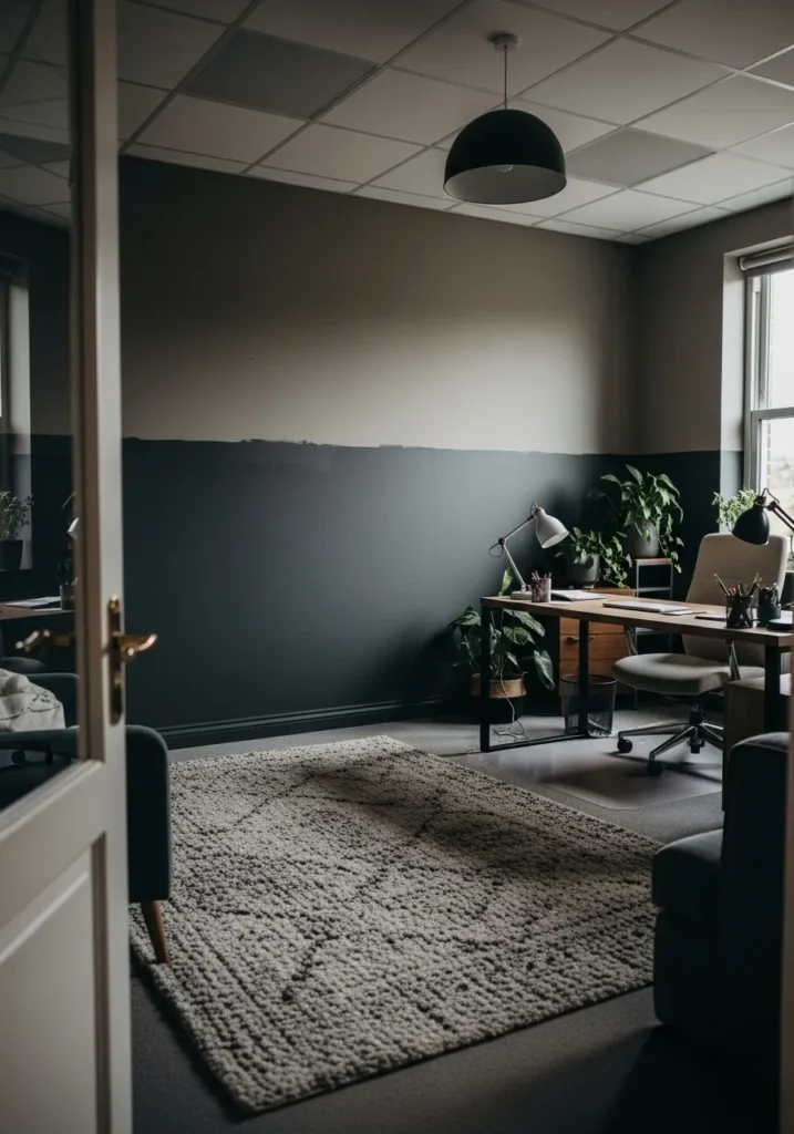 This office uses a subtle two tone charcoal effect, with a darker shade along the lower portion of the wall that fades into a softer gray above. The transition adds visual interest without overwhelming the space. A large textured rug and comfortable seating bring softness to the bold paint choice. Overhead lighting keeps the room feeling warm and inviting.