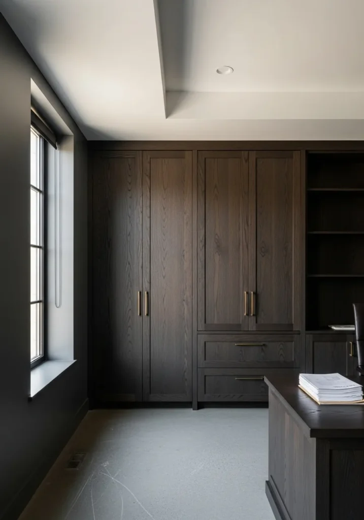This home office leans into deep walnut toned walls that blend beautifully with the full height cabinetry. The paint color feels almost espresso in certain light, especially near the window where soft daylight creates gentle contrast. Minimal hardware and clean lines keep the look tailored and modern. The smooth flooring and simple desk allow the rich wall color to take center stage.