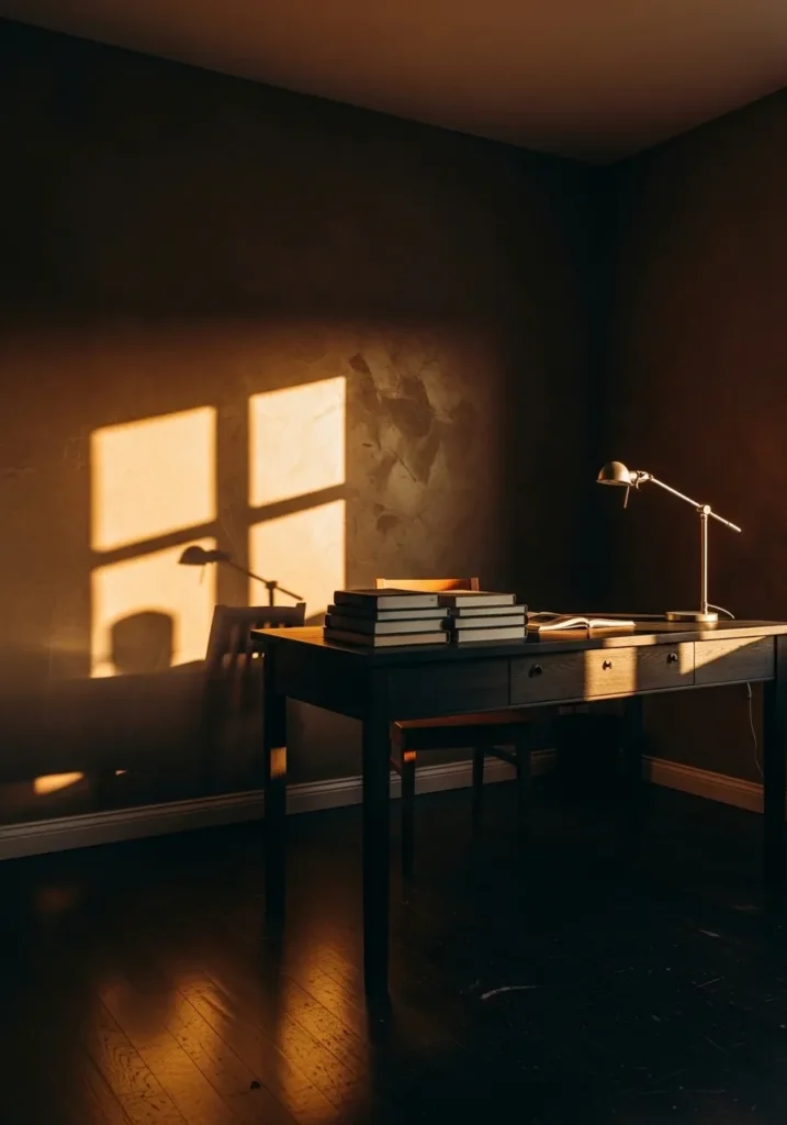 This home office leans into a smoky charcoal paint color that looks almost black in the shadows. Warm golden hour sunlight streams through the window and paints a soft rectangle of light across the wall and floor. A simple dark desk holds a small stack of books and a minimal desk lamp, keeping the styling clean and intentional. The contrast between the deep wall color and the warm light creates a stunning, high contrast mood.