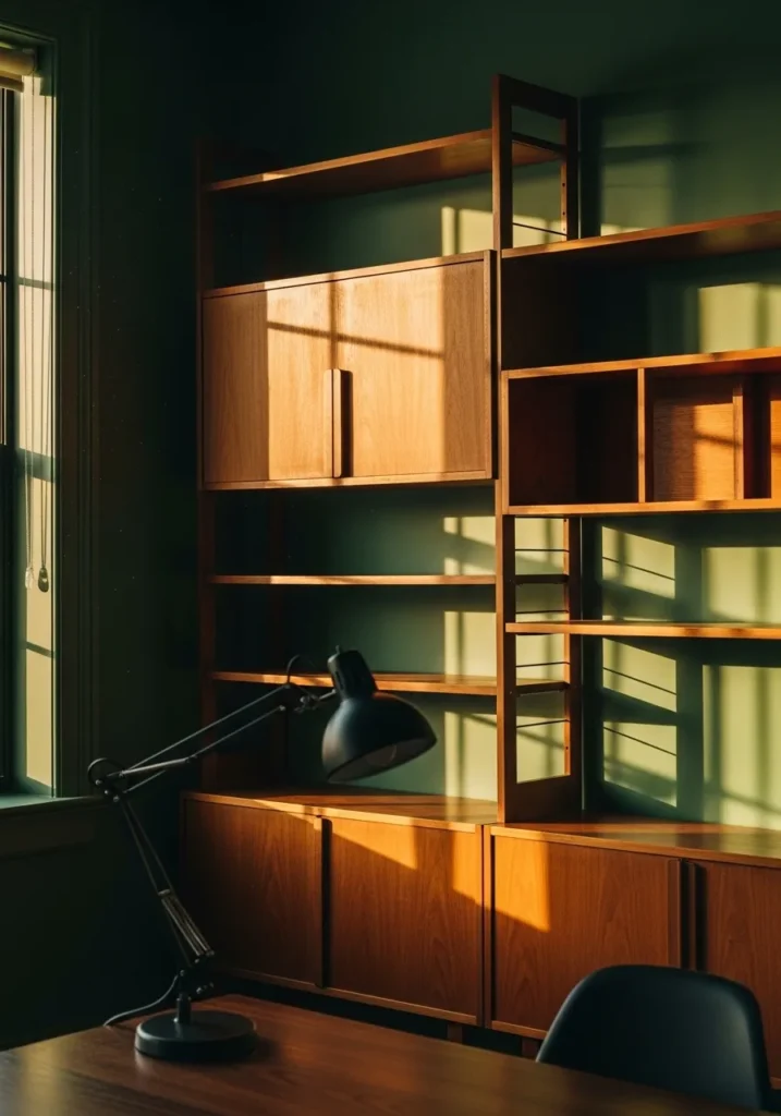 This office pairs a saturated forest green wall with warm wood shelving that glows in the sunlight. The built in units mix open and closed storage, adding both function and visual interest. Golden light streams through the window and hits the wood, creating a stunning contrast against the deep green. A simple desk lamp and streamlined desk keep the overall look balanced.