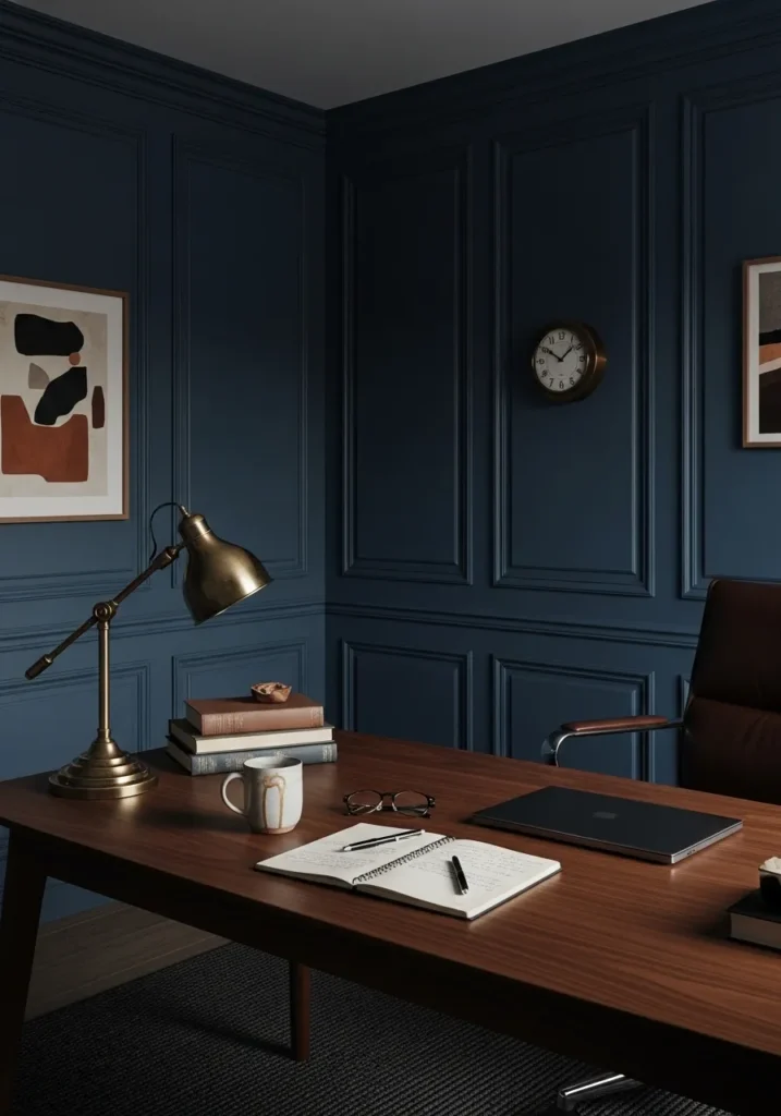 This office showcases deep navy paneled walls that instantly elevate the space. The molding adds subtle texture, giving the color even more dimension. A polished wooden desk and a brass task lamp introduce warmth and a touch of elegance. Natural light from the window softens the navy and keeps the room from feeling too dark.