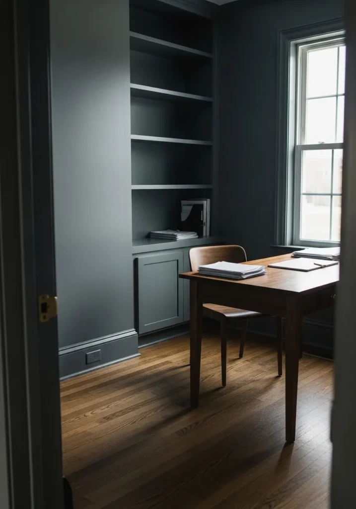 This office keeps things simple with smooth slate blue walls and very minimal decor. A slim black desk sits near the window, letting the paint color become the main feature. The muted blue feels cool and calm, especially with soft daylight brushing across the surface. The clean lines and open floor space create a sense of clarity.