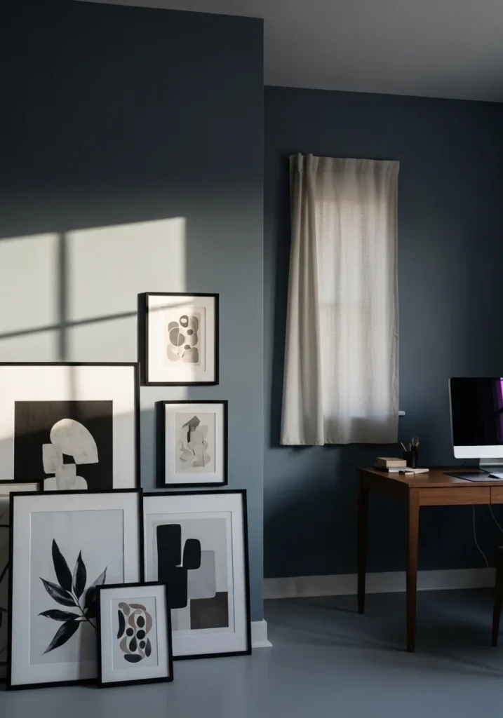 This space features a dusty slate blue that feels refined and timeless. The walls have a soft matte finish that absorbs light rather than reflecting it, which adds depth. A sleek desk sits against one wall, while framed black and white artwork leans casually nearby. A light curtain softens the edges of the window, balancing the cool paint color with a hint of warmth.