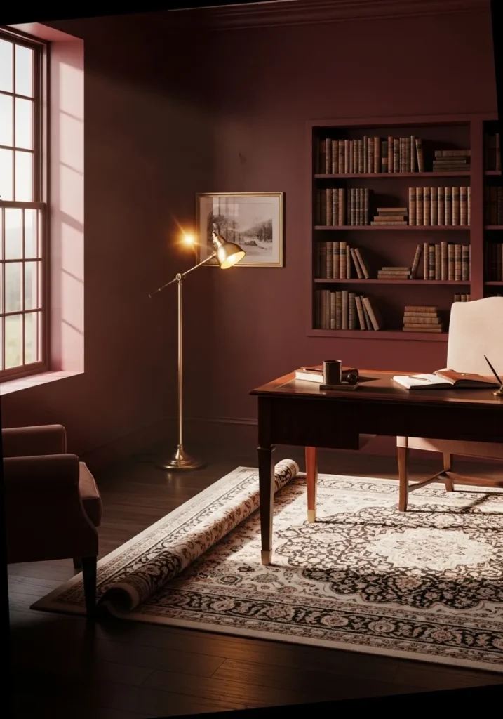 This home office embraces a deep burgundy paint that instantly elevates the space. The walls feel enveloping and luxurious, especially when paired with warm wood floors and a patterned area rug. A tall floor lamp casts a soft glow near the desk, while built in bookshelves add texture and interest. Natural light from the window keeps the bold color from feeling too heavy.