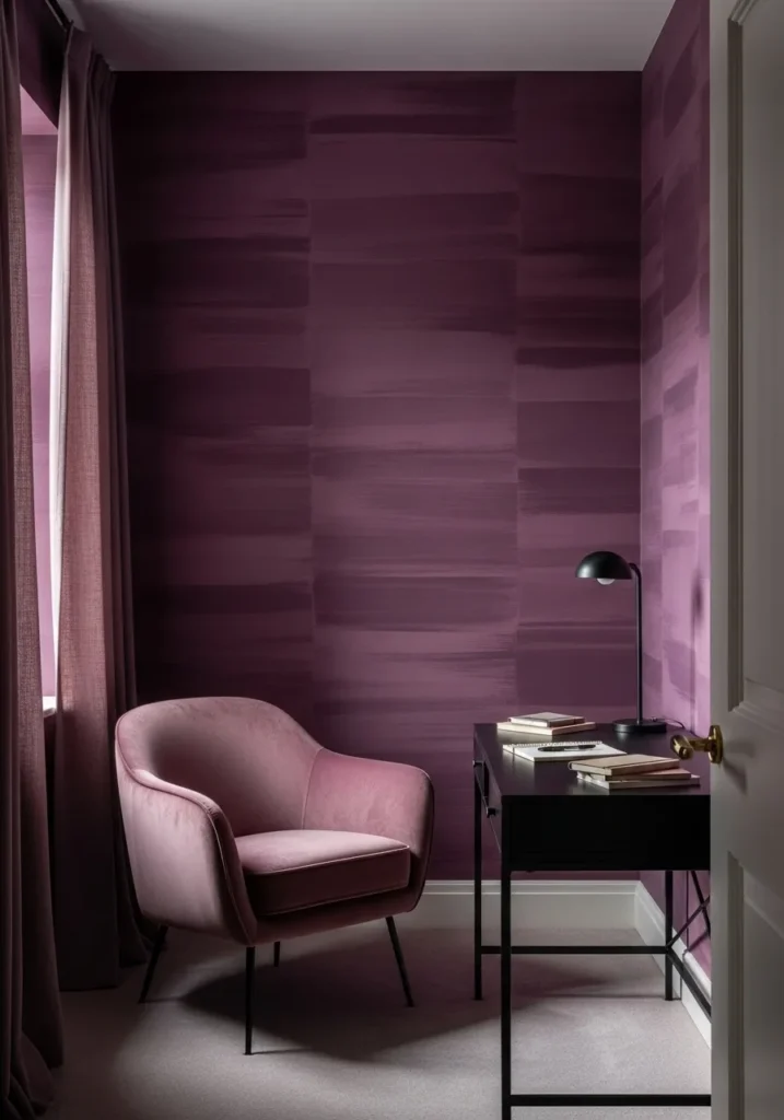 This small office nook features a layered plum paint that shifts subtly in the light. The walls feel intimate and slightly dramatic, especially in a compact space. A soft upholstered chair in a muted blush tone sits beside a slim desk, adding a gentle contrast to the darker walls. Light from the window filters in softly, giving the room a quiet glow.