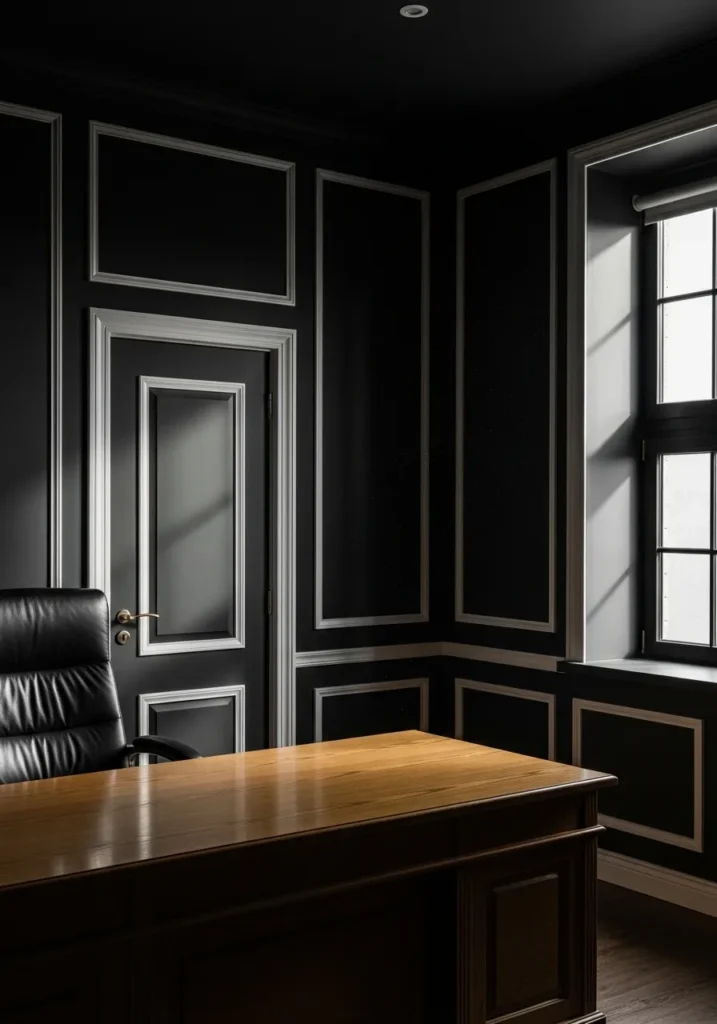 This home office embraces a deep near black paint that highlights the intricate wall paneling and crisp white trim. The contrast between the dark walls and the window frames makes the architectural details stand out beautifully. A warm wood desk anchors the space and adds a layer of richness against the bold backdrop. Natural light filters in softly, creating subtle reflections across the paneled surfaces.