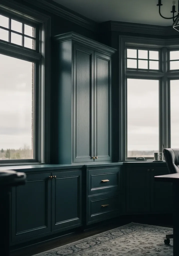 This space features a saturated teal that wraps around built in cabinetry and window trim for a seamless look. The color feels deep and enveloping, especially around the bay window area where natural light gently hits the surfaces. Paneled cabinet doors and classic hardware add structure and balance to the bold paint choice. The overall effect is refined yet welcoming.
