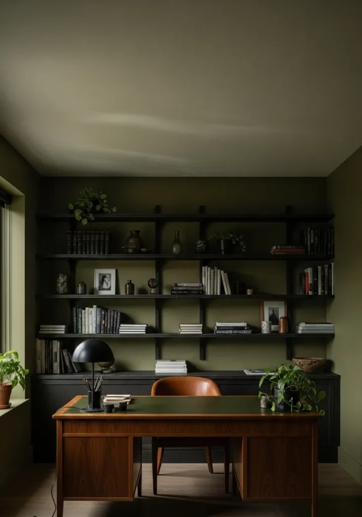 This office leans into a muted olive green that pairs beautifully with warm wood shelving and a classic desk. The wall color has an earthy depth that feels calming and steady. Open shelves display books and simple decor, adding personality without clutter. Soft overhead light and gentle daylight keep the room from feeling too dark.