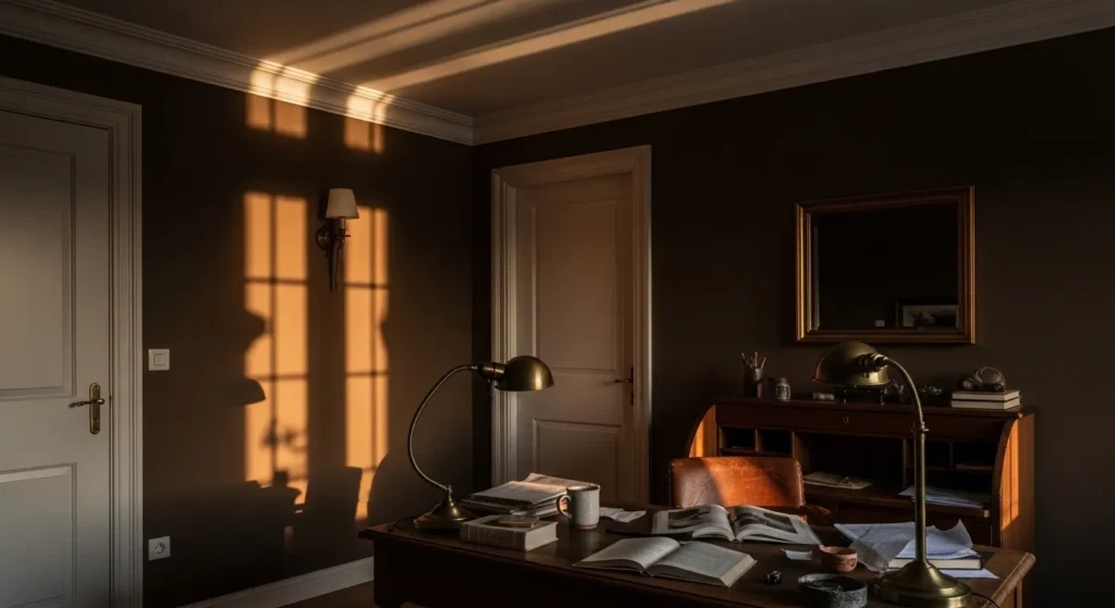 I am always amazed at how magical dark walls can look when natural light hits them just right. The golden glow against that charcoal shade feels romantic and quietly powerful. It makes the room feel like a private retreat where serious thinking happens. I find this kind of dramatic lighting so inspiring for late afternoon work sessions.