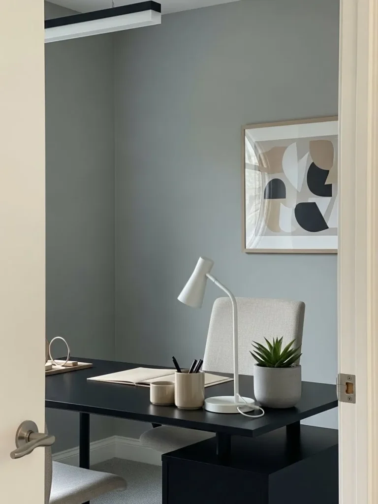 This home office keeps things calm and quietly stylish with its soft blue gray walls that instantly make the space feel balanced and modern. The color sits perfectly between cool and warm which gives it that effortless designer look without feeling cold. A sleek black desk anchors the room and adds contrast while the light upholstered chair softens the overall vibe. Simple decor like the sculptural desk lamp, neutral art print, and small potted plant keeps the space feeling uncluttered and intentional. Everything feels thoughtfully placed yet relaxed, like a room that actually gets used every day.