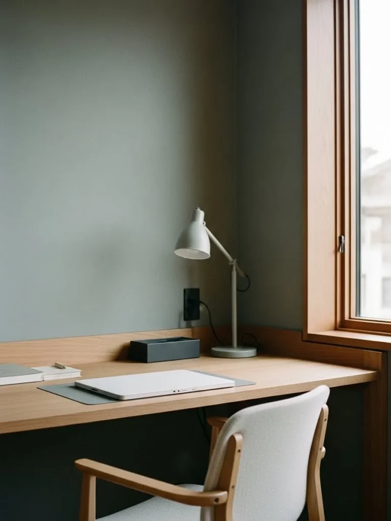 This home office feels effortlessly calm thanks to the muted sage green walls that set a relaxed and modern tone without trying too hard. The color has just enough depth to feel interesting, but it stays soft and airy, especially paired with the light wood desk and simple black accents. Clean lines, minimal decor, and natural light coming in from the window keep the space feeling open and uncluttered, while small details like stacked books and a matte black task lamp add a cozy, lived in vibe. It is the kind of setup that feels practical for everyday work but still looks polished enough to photograph beautifully.