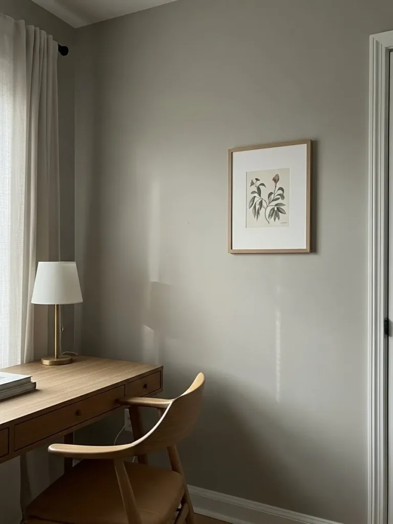 This home office keeps things calm and collected with soft greige walls that feel warm without leaning yellow or cold gray. The color wraps the space in a gentle, cozy way and pairs beautifully with the light wood desk and chair. Everything feels intentional but not overstyled, from the simple framed artwork to the small potted plant adding a touch of life. Natural light sneaks in from the side window and makes the paint color glow just enough, giving the room that quiet, balanced look that works for both focused mornings and slow afternoon tasks.