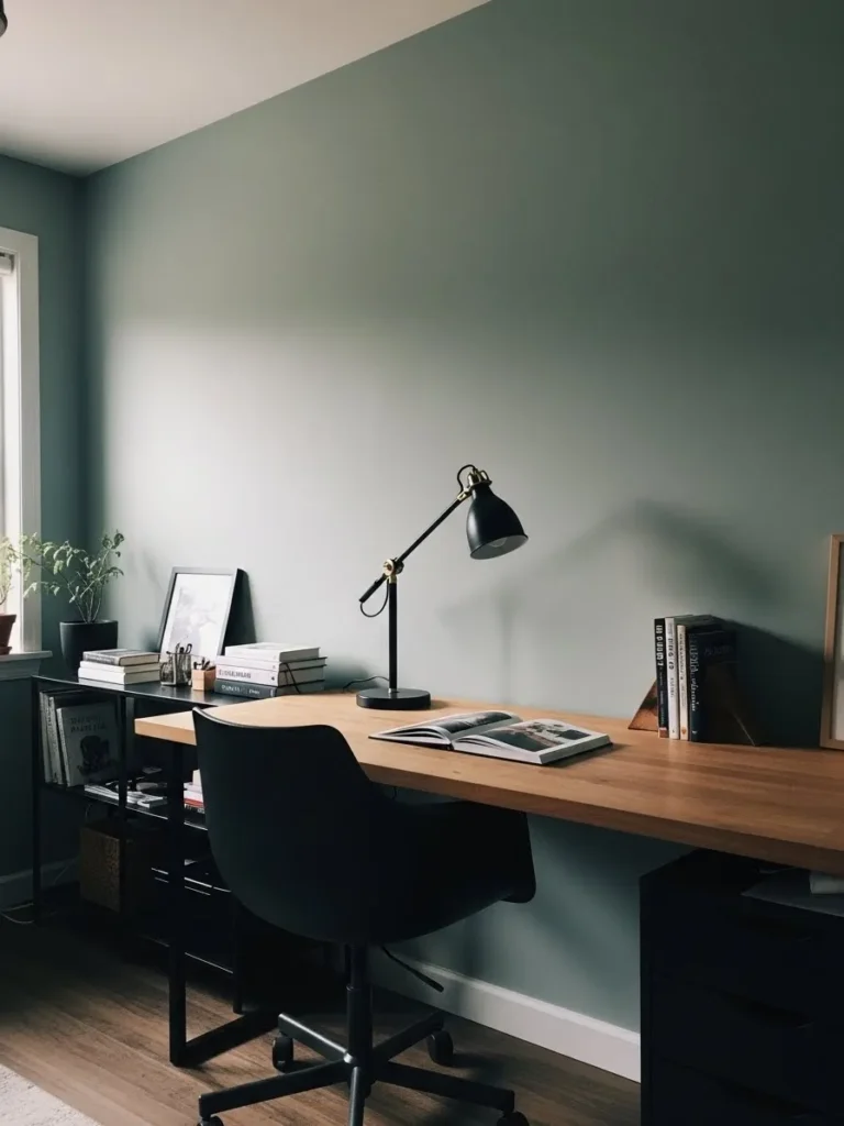 This home office feels calm and grounded thanks to the soft sage green walls that instantly set a relaxed mood. The color has that muted earthy quality that feels modern without trying too hard, especially paired with the clean black desk and simple chair. Natural light filters in through the blinds and creates those pretty striped shadows across the wall and desk, which honestly makes the whole space feel quietly styled without adding clutter. The decor stays minimal with a single framed art print and a sleek desk lamp, letting the paint color do most of the heavy lifting.