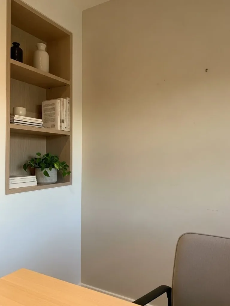 This home office keeps things calm and quietly stylish with its soft sand toned walls and clean minimalist setup. The paint color feels warm without leaning yellow and neutral without feeling flat which is such a sweet spot for an office space. Built in wooden shelving adds just enough texture and warmth while still keeping the look airy and uncluttered. Light wood furniture and simple decor make the whole room feel intentional but not overdone which is exactly what a modern muted palette should do.