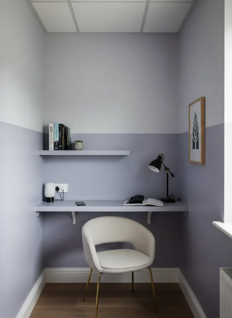 This cozy little office nook makes the most of a small space with a soft lavender gray paint that feels calm without leaning cold. The two tone wall treatment adds just enough visual interest while still keeping everything quiet and modern. A simple floating desk and matching shelf keep the look light and uncluttered, while the pale upholstered chair adds a touch of softness that balances the clean lines. I love how the muted color wraps the space and instantly makes it feel intentional instead of like an afterthought corner.