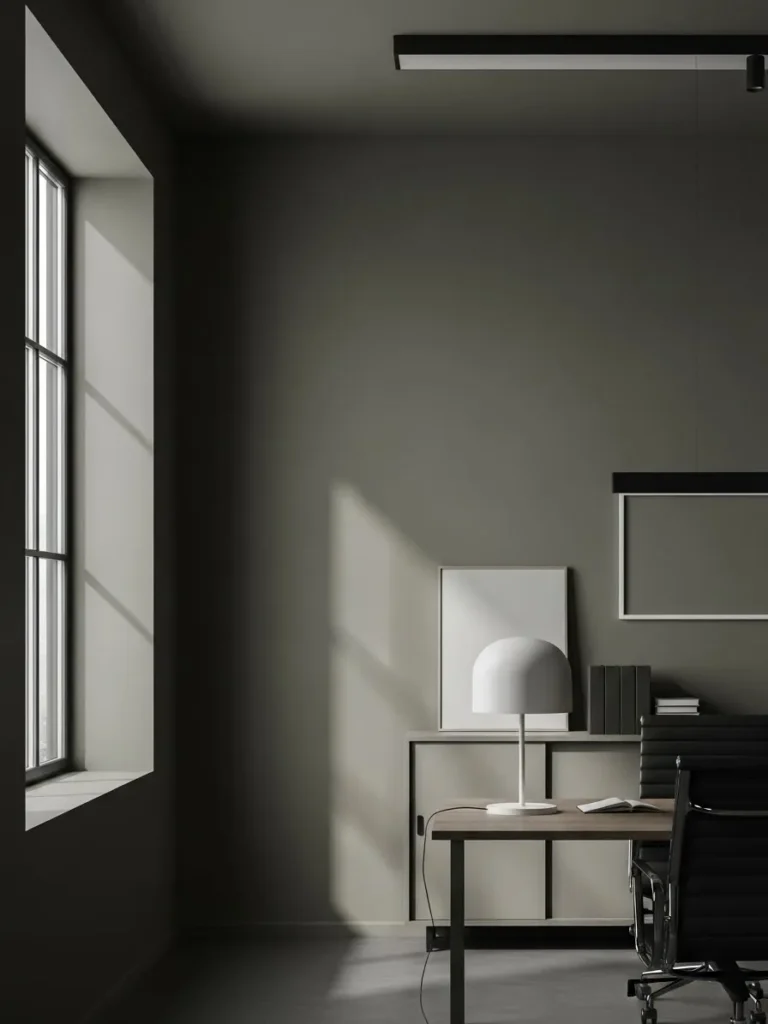 This office design leans into a soft olive gray wall color that feels calm, modern, and quietly sophisticated. The muted tone has a gentle warmth to it, especially when paired with the clean black desk, slim shelving, and simple decor pieces. Natural light from the large window creates beautiful shadows on the wall, giving the space depth without making it feel heavy. The overall look is minimal but not cold, with smooth surfaces, subtle contrast, and just enough styling to feel intentional rather than bare.