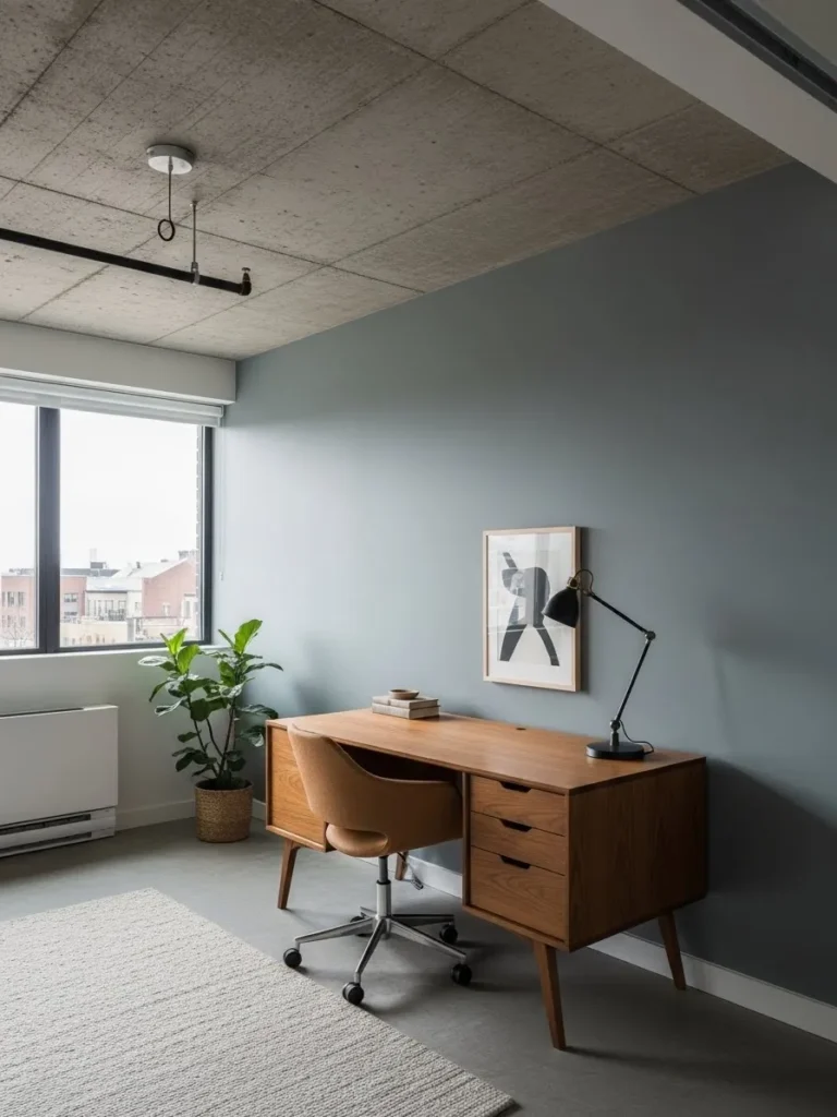 This office design feels calm and modern in the best possible way thanks to the soft blue gray wall color that gently grounds the entire space. The muted paint tone pairs beautifully with the warm wood desk and chair, creating a balanced look that feels both cozy and intentional. Natural light from the large window keeps the room airy, while the concrete ceiling adds a subtle industrial edge that still feels approachable. Simple styling choices like the framed art, matte black desk lamp, and leafy plant keep things clean without feeling bare or cold.