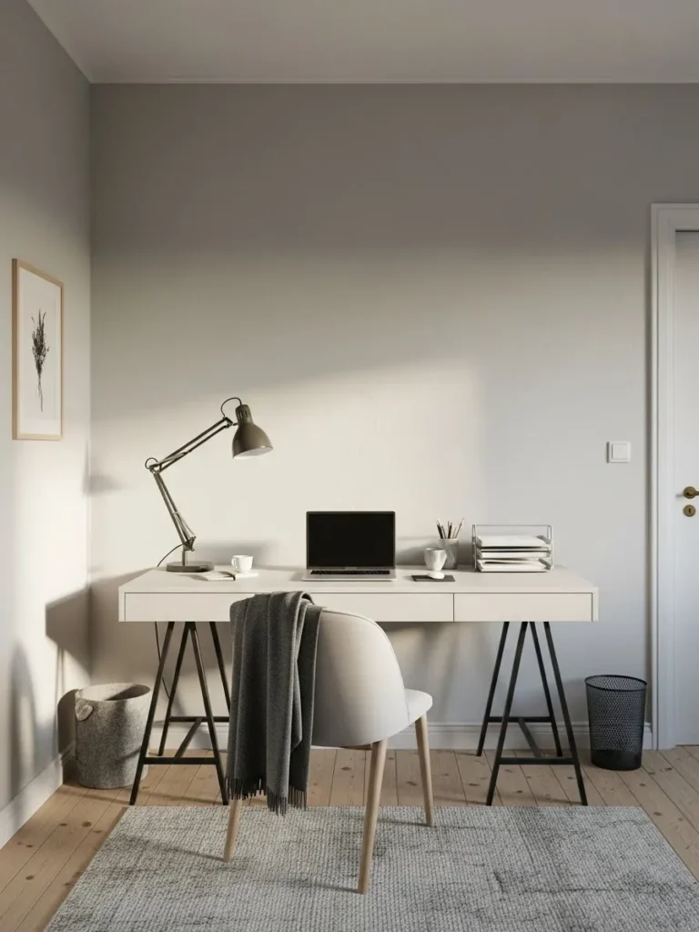 This home office uses a soft greige wall color that feels calm and modern without looking cold. The paint sits perfectly between warm beige and gentle gray which makes the space feel balanced and easy on the eyes. Light wood floors add warmth while the white desk keeps everything fresh and uncluttered. Black metal legs bring in a subtle contrast that grounds the space without stealing attention. The overall setup feels airy and intentional with just enough decor to keep it from feeling bare.