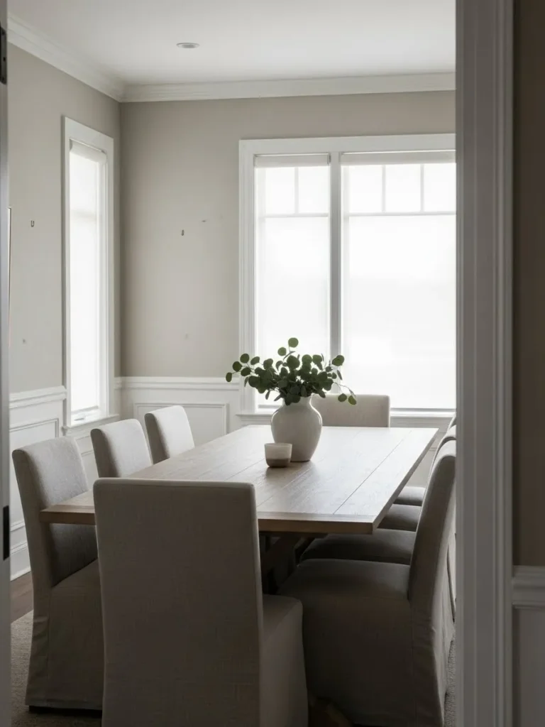 This dining room features a soft greige paint color that feels calm, balanced, and timeless. The walls create a gentle backdrop that works beautifully with the light upholstered chairs and the simple dining table. Crisp white trim adds definition without overpowering the space, and the natural light coming through the window makes the paint color feel warm and inviting rather than flat or cool.