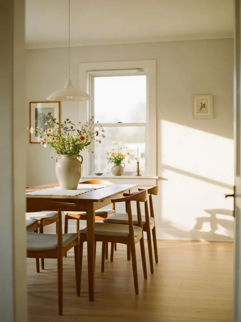 I am completely drawn to how inviting this room feels. The way the light hits the walls makes the space feel almost magical without trying too hard. It reminds me why neutral colors can be so powerful when paired with the right light. This is the kind of dining room that makes even a simple meal feel special.