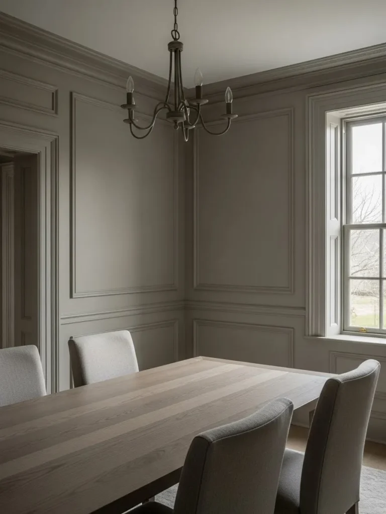 This dining room features a deeper neutral paint color that highlights the beautiful wall paneling and classic trim. The walls add depth and drama while still staying within a timeless neutral palette. Paired with a simple wood dining table and soft upholstered chairs, the space feels intimate and thoughtfully designed. The muted tone works especially well with natural light filtering in through the window.