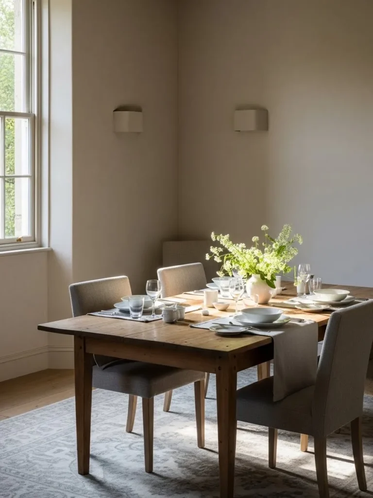 I am drawn to how calm and quiet this room feels. The paint color almost melts into the background in the best way. It feels like a space made for slow mornings and simple meals. That kind of softness always makes a dining room feel more inviting to me.