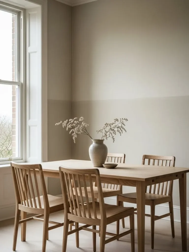 This dining room features a soft two tone neutral paint treatment that adds visual interest while staying timeless. The lower portion of the walls feels slightly warmer, while the upper section keeps the room light and open. Paired with a simple wooden table and classic chairs, the space feels intentional and quietly refined.