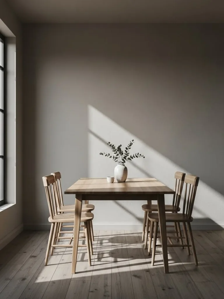 This dining room is painted in a cool neutral shade that looks especially beautiful in natural light. The walls feel smooth and understated, allowing the sunlight to create gentle shadows throughout the space. A small wooden dining table and simple chairs keep the look minimal and airy.