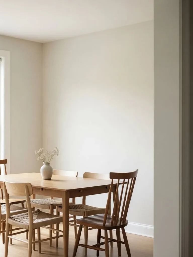 This dining room uses a creamy neutral paint color that reflects light beautifully and creates a soft, airy atmosphere. The walls have a subtle warmth that pairs perfectly with the wooden dining table and minimal table setting. Gentle shadows from the window add depth to the space, giving the paint color a rich and layered look that feels calm and intentional.