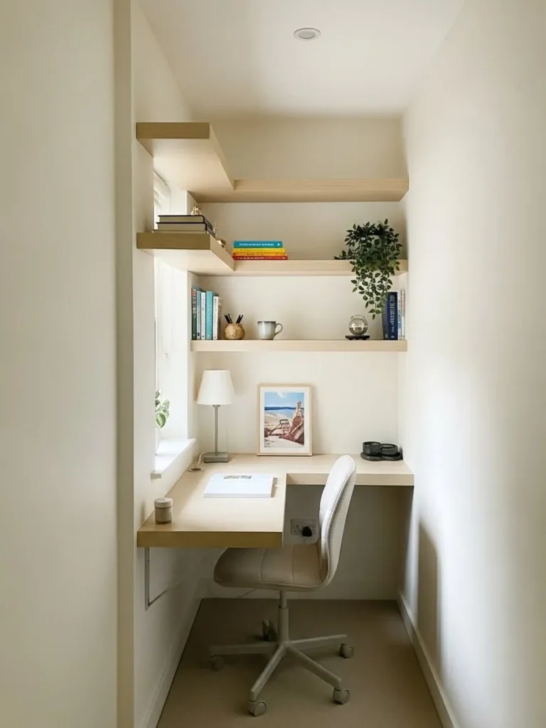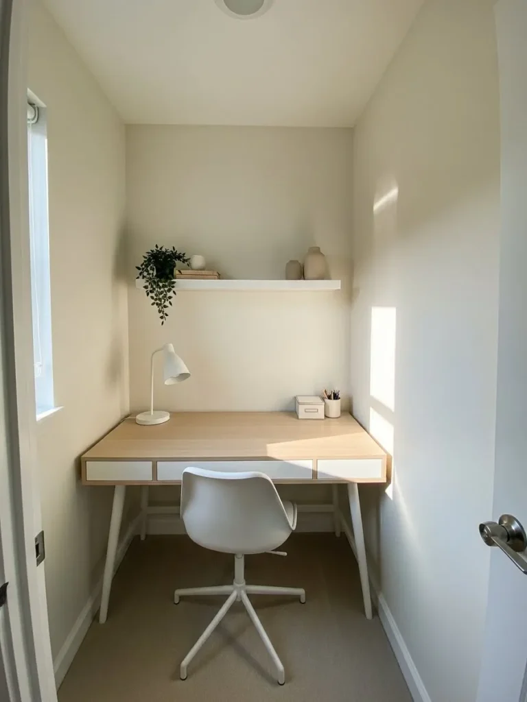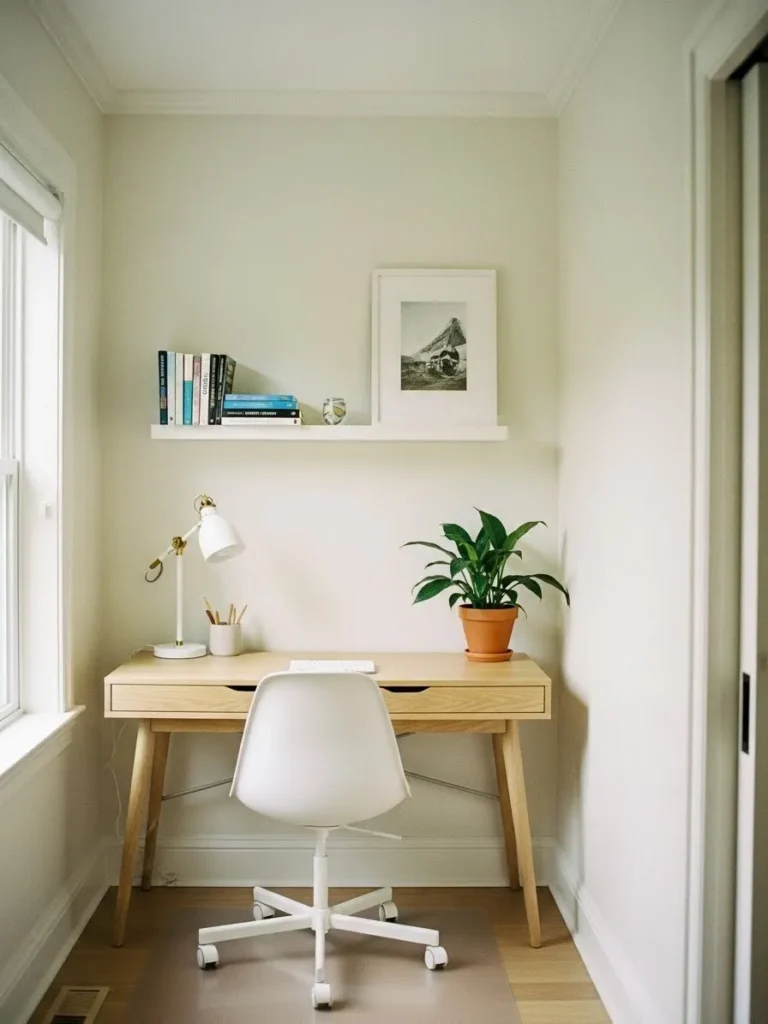 This small office nook uses soft cream walls to gently reflect light and make the space feel taller and wider than it really is. The pale paint pairs beautifully with the light wood desk and white chair, creating a clean and airy look that never feels cramped. A floating shelf keeps decor off the floor and adds visual height, while simple accessories like neutral vases and a trailing plant bring warmth without clutter. Natural light from the side window bounces around the room, which is exactly what you want in a tiny workspace.