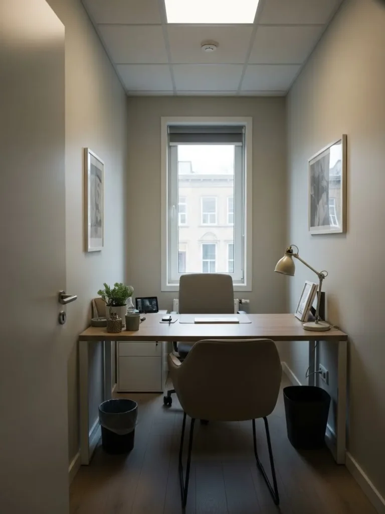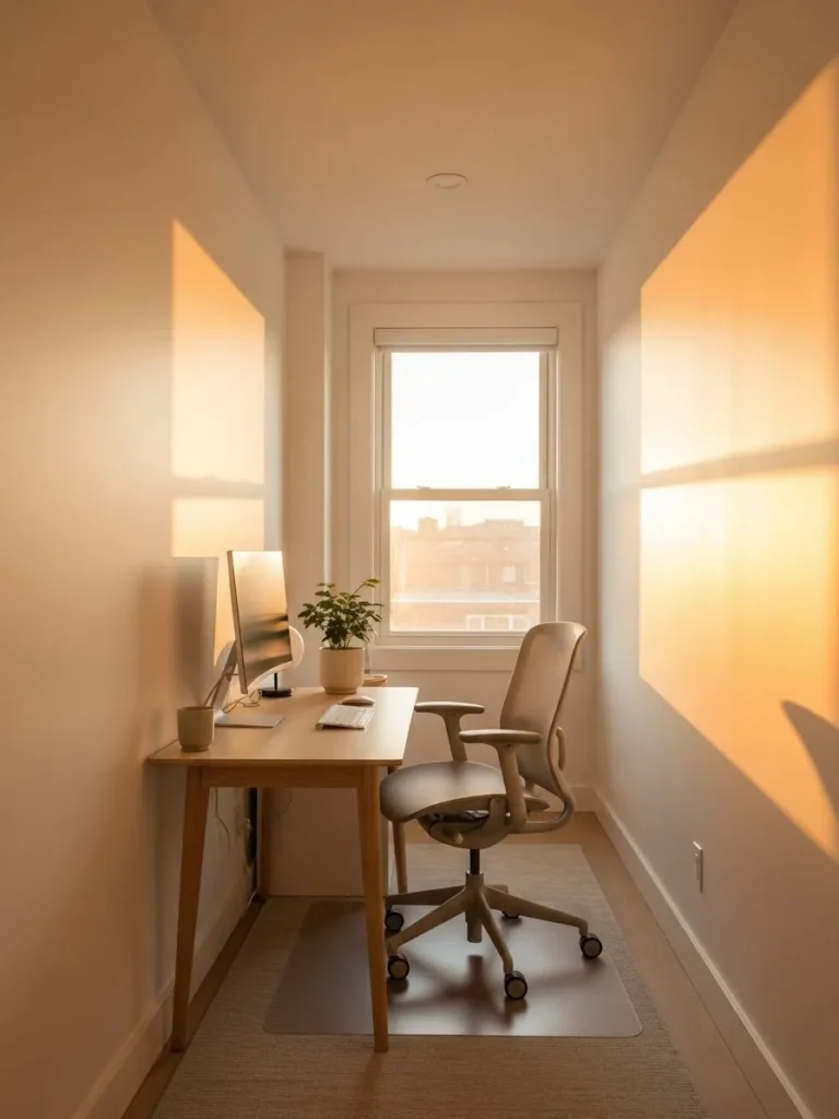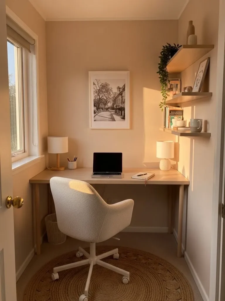 I honestly love how peaceful this setup feels. The creamy walls paired with that golden sunset glow make the room feel gentle and welcoming instead of boxy or tight. I can picture myself sitting here with a coffee feeling productive but also relaxed which is a rare combo. It proves that you do not need bold colors or heavy furniture to make a small office shine. Sometimes soft simple and warm really is the magic formula.