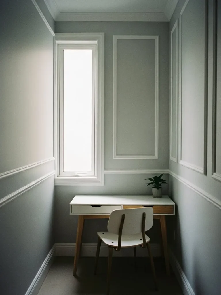 This tiny office nook uses a soft sage green paint that instantly makes the space feel taller and airier. The light green walls reflect natural light from the tall window, which helps the narrow layout feel less boxed in and more open. Simple wall paneling adds subtle depth without overwhelming the room, while crisp white trim keeps everything looking clean and intentional. The slim desk and minimal chair fit perfectly without crowding the space, proving that even the smallest corner can work hard and look good doing it.
