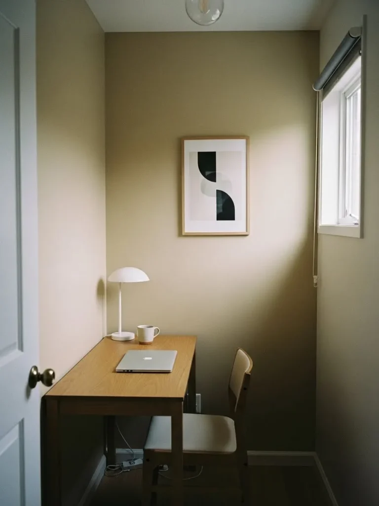 This tiny home office keeps things calm and open with soft olive beige walls that gently reflect light instead of swallowing it. The color feels warm without going dark which is exactly what small rooms need. A simple wood desk and pale chair blend in rather than compete with the space. Natural light from the window does most of the work here and the clean lines help the room feel taller and wider than it really is. Nothing feels crowded and every element has room to breathe.
