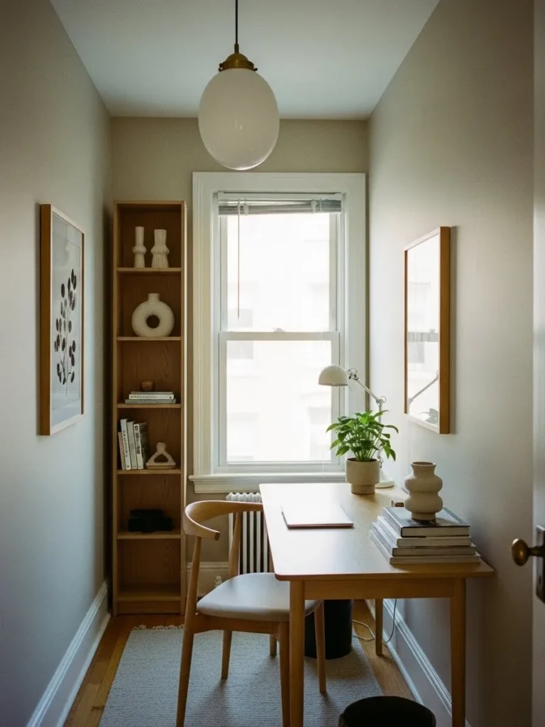 This small office nook uses a soft neutral paint color that instantly makes the space feel taller and wider. The walls reflect natural light from the centered window, which helps the room feel open instead of boxed in. Light wood furniture keeps everything airy, while the simple desk, curved chair, and slim shelving avoid visual clutter. Subtle decor like ceramic vases, framed art, and a small plant add warmth without overwhelming the space. The overall look is calm, balanced, and thoughtfully minimal, which is exactly what a narrow room needs.