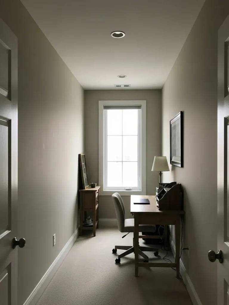 This narrow hallway office uses a soft taupe wall color that instantly makes the space feel wider and calmer. The light neutral tone reflects natural light from the window at the end of the room, which helps stretch the walls visually instead of closing them in. Simple white trim keeps everything crisp, while the slim desk and armless chair maintain an open flow. The clean lines and minimal furniture choice prove that even a tight footprint can feel intentional and comfortable with the right paint color.