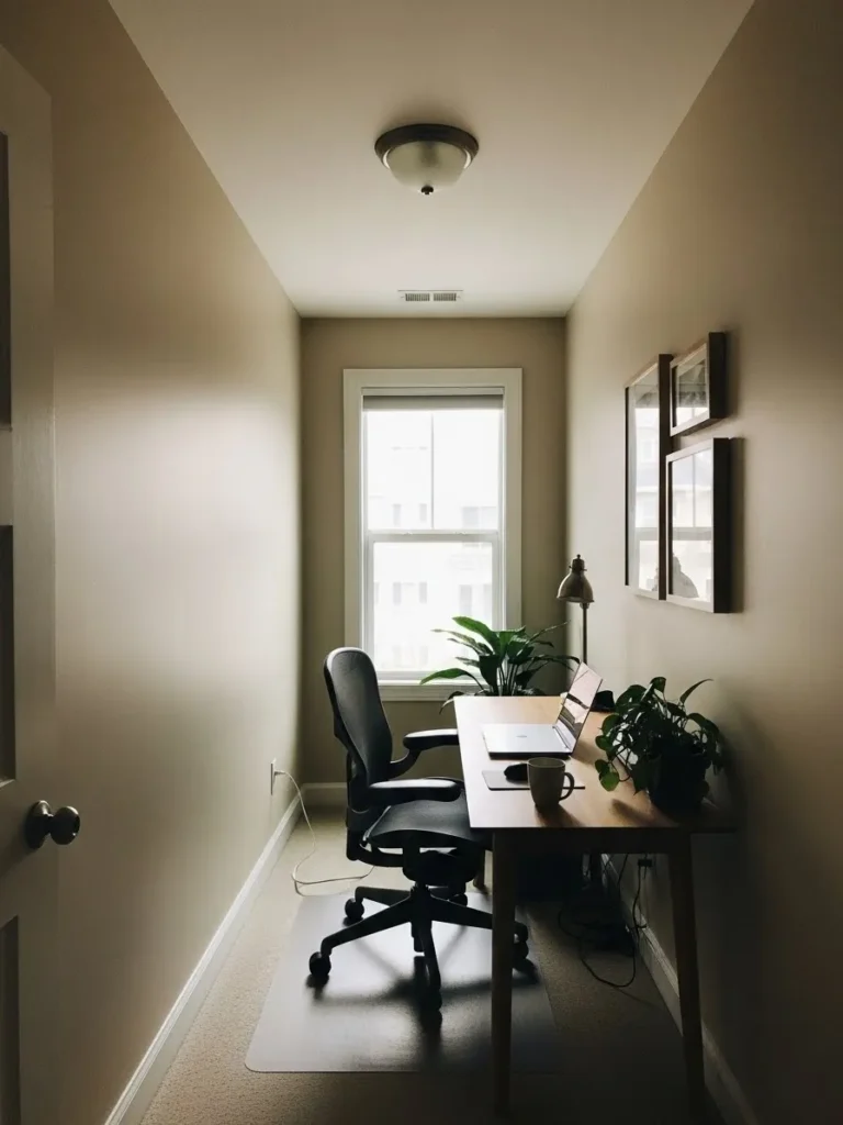 This cozy little home office makes the most of a narrow layout by leaning into warm neutral wall colors that reflect light beautifully. The soft beige walls paired with crisp white trim help the space feel taller and more open instead of boxed in. A simple wood desk, a comfortable black office chair, and a few leafy plants keep the setup practical but not boring. Natural light from the window does a lot of heavy lifting here, bouncing off those light walls and instantly making the room feel brighter and more breathable. The clean lines, minimal wall decor, and uncluttered floor help everything feel calm and intentional.