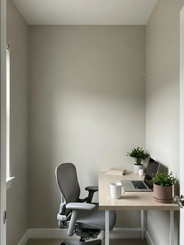 I honestly love how peaceful this setup feels. It reminds me that small rooms do not need bold colors or heavy furniture to look beautiful. This kind of soft neutral office feels like the place where ideas flow easily and stress stays far away. I can totally picture myself sitting here with a coffee, sunlight pouring in, and actually enjoying getting things done. It proves that the right paint color can quietly work magic in the tiniest spaces.