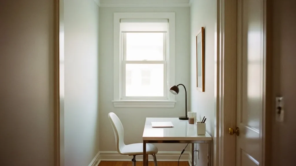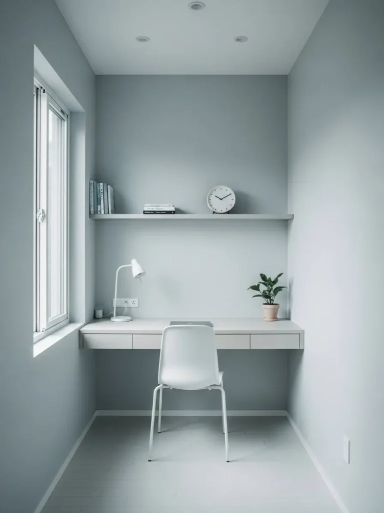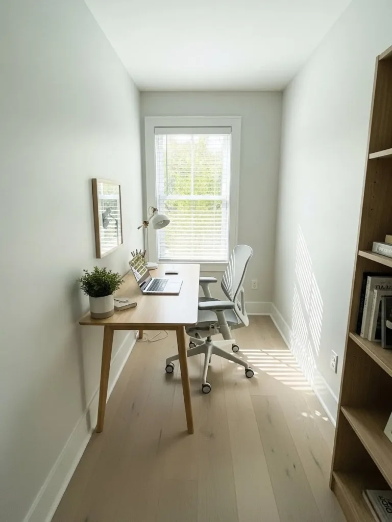 This small office nook keeps things airy with soft gray walls that gently reflect light and make the space feel taller and wider. The clean lines of the light wood desk add warmth without visual clutter, while the slim profile keeps the room from feeling boxed in. A simple white desk chair blends seamlessly into the space and helps maintain that open, uncluttered look. Natural light bouncing off the pale walls and white trim gives the whole setup a calm and spacious vibe that works beautifully in narrow rooms or unused corners.